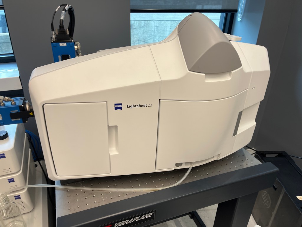The ZEISS Z1 Lightsheet Microscope is a fluorescence microscope. Using two sheets of light, this microscope is capable of obtaining high resolution 3D datasets of optically cleared or translucent specimens.